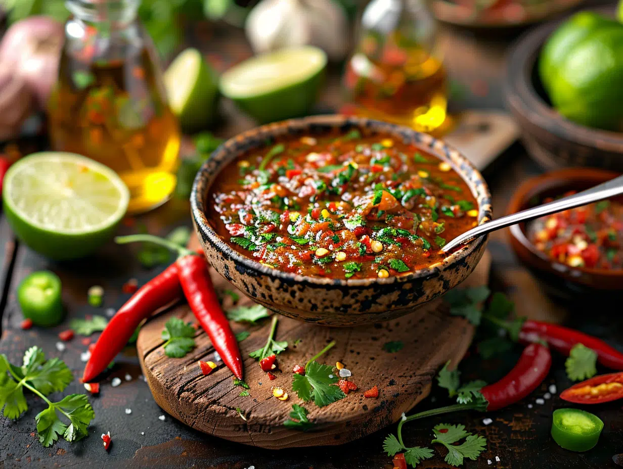 Le choix des piments est fondamental pour obtenir l’équilibre parfait entre saveur et piquant. Utilisez un piment végétarien pour sa saveur douce et parfumée, et ajustez avec un piment fort selon votre tolérance au piquant. Hachez-les finement et incorporez-les au mélange.